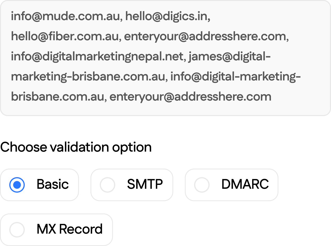Choose your validation levels: basic checks, SMTP verification, DMARC, or MX record validation for accurate email campaign results.