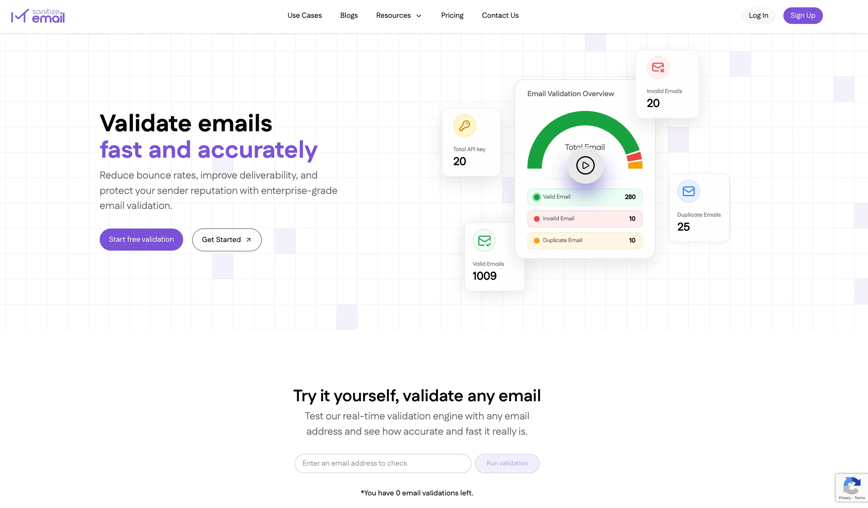 If you want to validate emails with high accuracy, bulk support, and free credits to get started, you can try SanitizeEmail before committing to a plan.