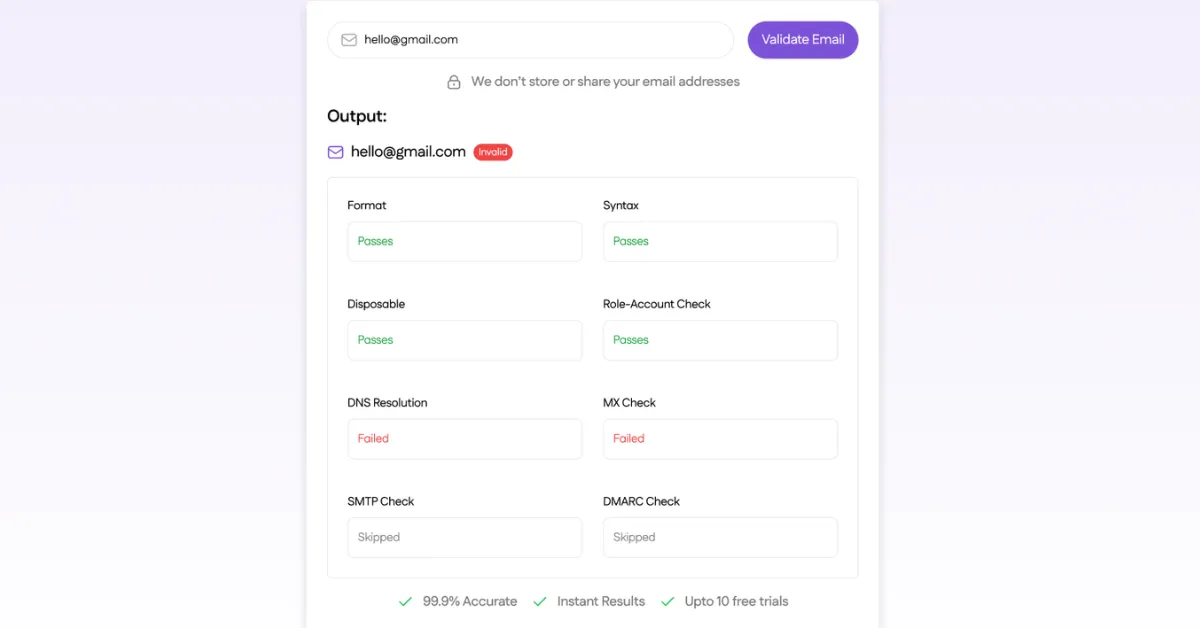 Using a free email validator helps you identify these issues early, so you can fix them before they negatively impact your campaigns, deliverability, and sender reputation.